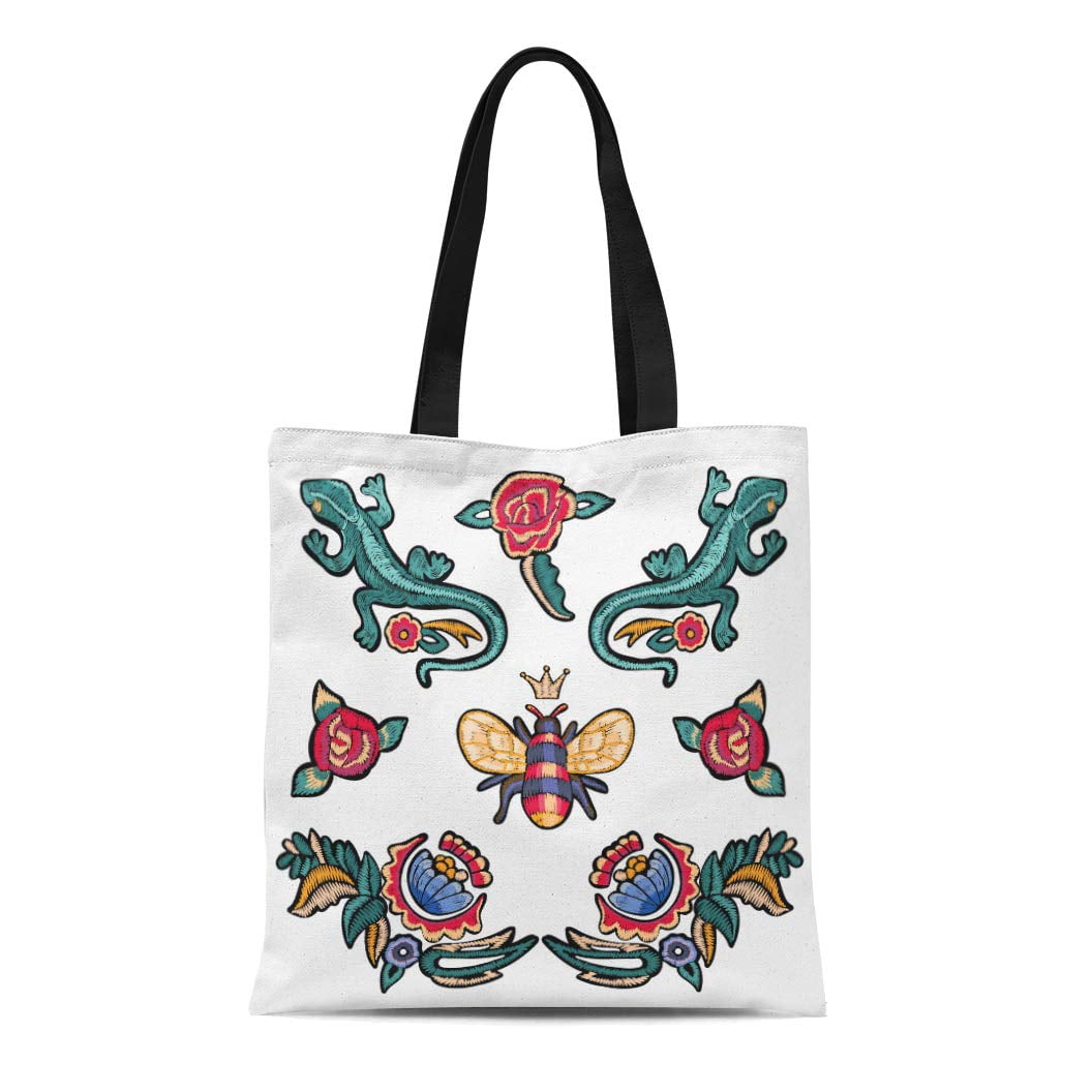 Laddke Canvas Tote Bag Patch Floral Patches Roses Lizards And Bee Embroidered Flowers Durable Reusable Shopping Shoulder Grocery Bag Embroidered Flower And Bird Print Handbag Portable Versatile Shoulder Bag Vladatk Gov Ba
